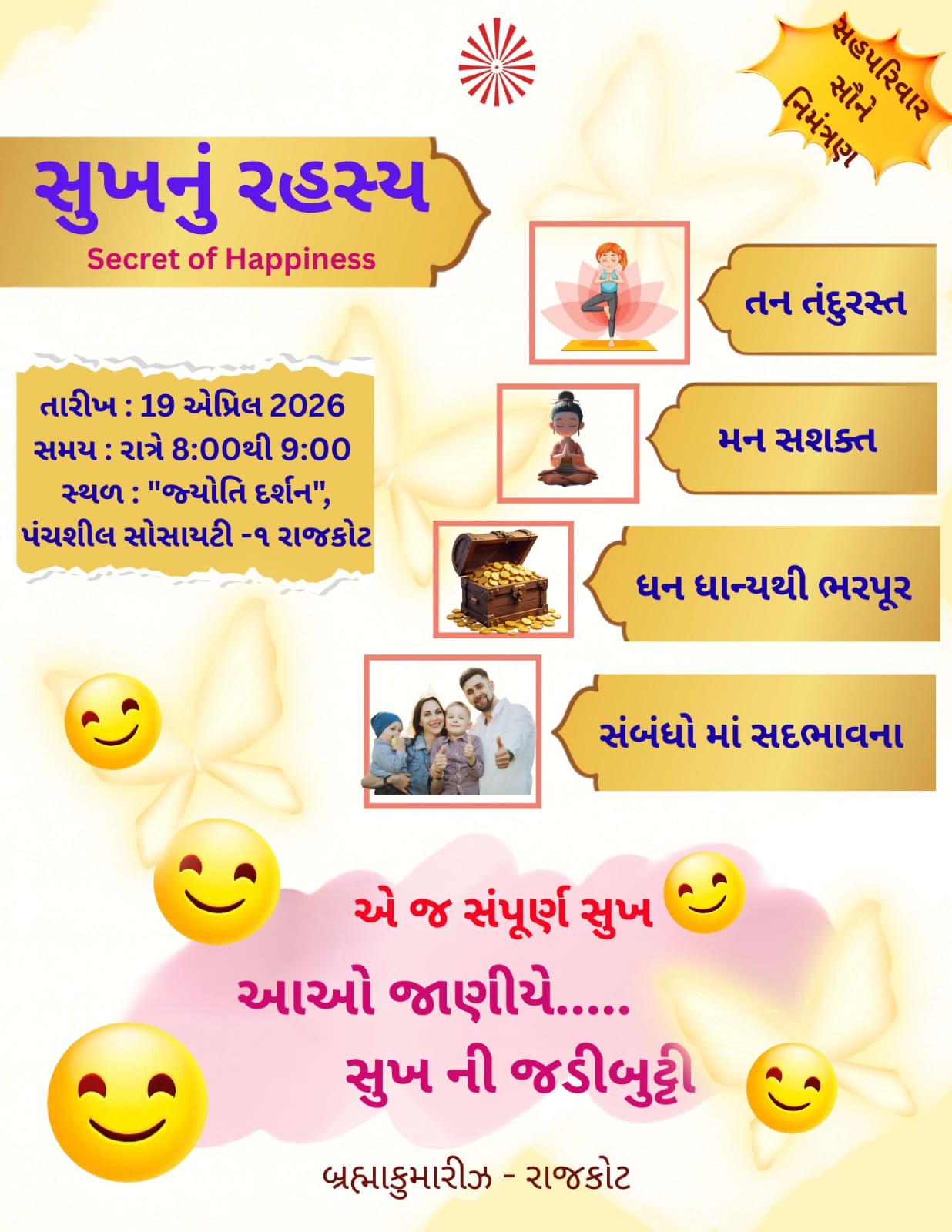 – Conducted topics on happiness of body, mind and money by sharing spiritual knowledge